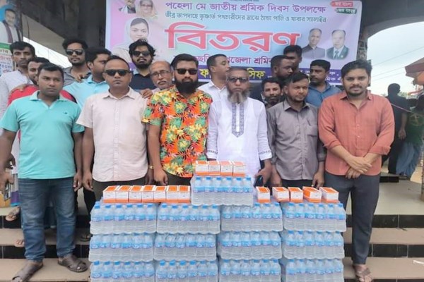 পহেলা মে জাতীয় দিবস উপলক্ষে পদচারীদের মাঝে ঠান্ডা পানি ও খাবারের স্যালাইন বিতরণ