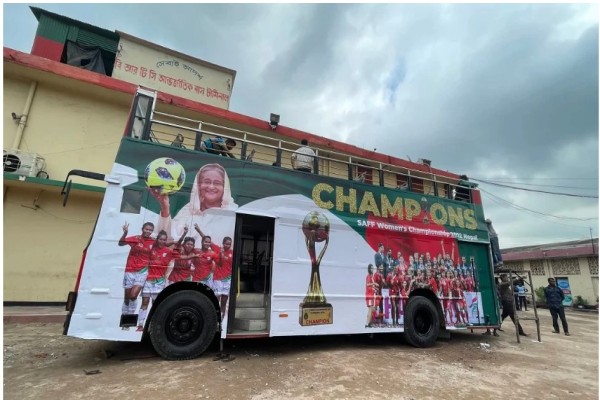 নারী ফুটবল দলের জন্য ছাদখোলা বাস প্রস্তুত