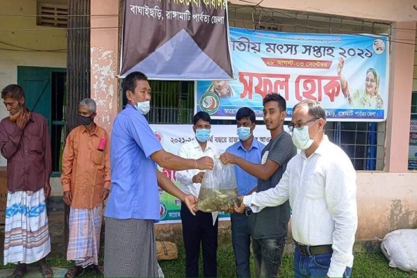 বাঘাইছড়িতে মৎস্য চাষিদের মাঝে বিনামূল্যে মাছের পোনা বিতরণ