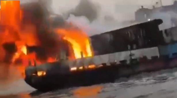 মাঝ নদীতে ফেরিতে আগুন, ৮টি ট্রাক পুড়ে ছাই