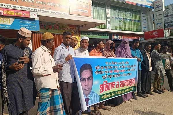শান্তিরহাট বাজারে আবু তৈয়ব সওদাগরের হত্যাচেষ্টা ও মিথ্যা মামলার প্রতিবাদে মানববন্ধন